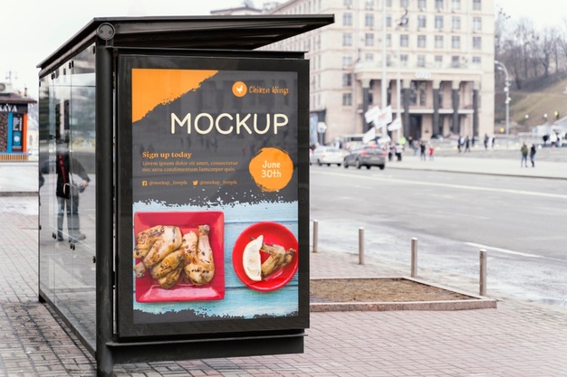 Outdoor advertisement bus shelter mockup ideal for different types of ads and branding designs. It is free to download and uses smart object layers.