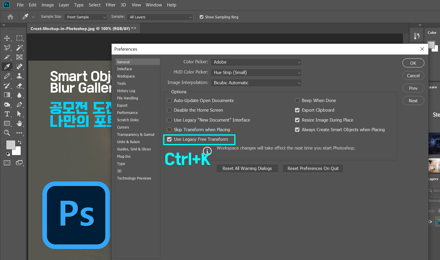 Shift키로 비율을 유지하고 작업하는 Free Transform [Ctrl+T]을 자유롭게 사용하기 위해서, [Ctrl+K]를 누르고 Edit - Preferences - General에서 Use Legacy Free Transform을 체크하고 사용하세요.