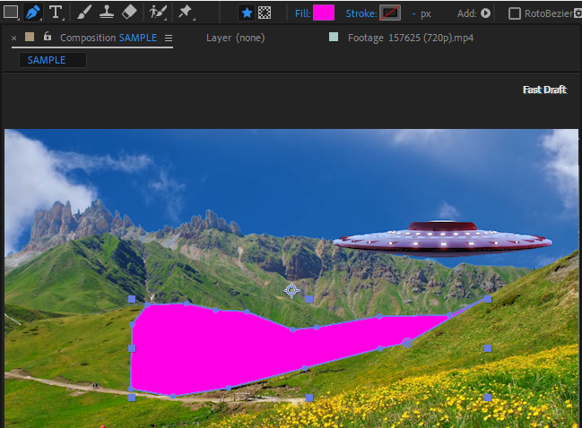 Pen tool로 그림자표현을 위해 처리한 UFO레이어의 범위를 제한적으로 보이는 Track Matte Alpha 마스크 작업을 위해 Shape를 그려서 바로 위에 배치해야 합니다.