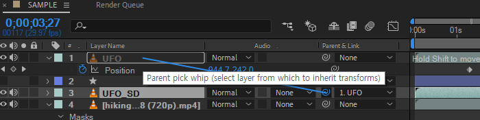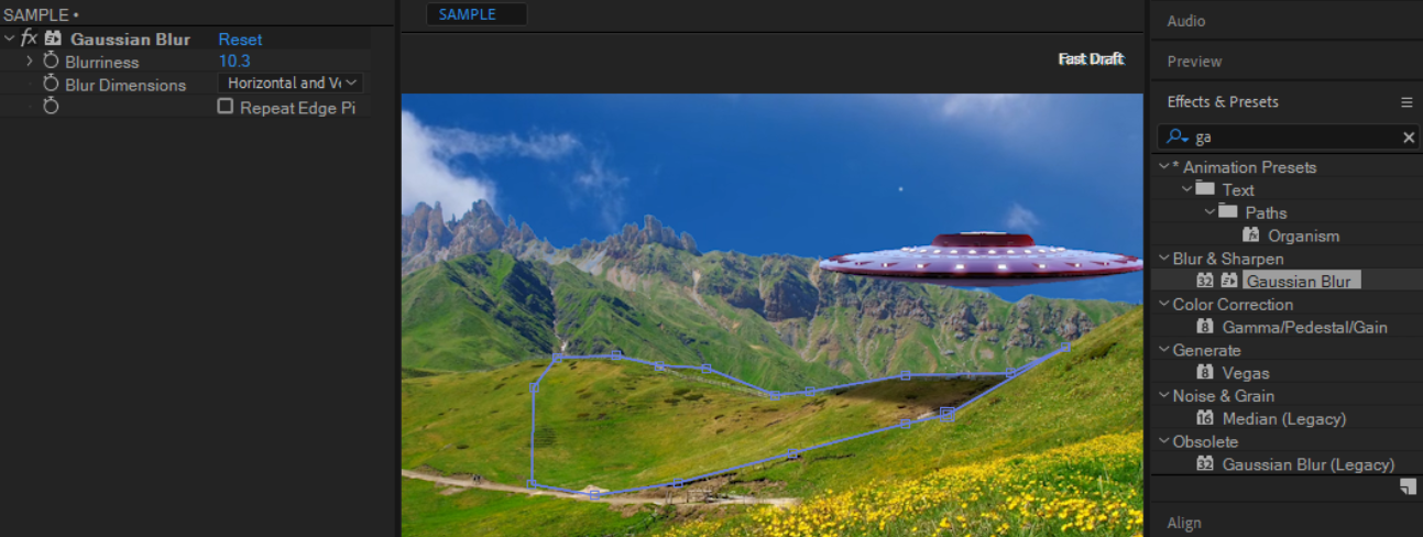 원본 UFO를 움직여서 애니메이션을 표현합니다. 그림자 역할을 하는 UFO가 제한적으로 보이는 Shape의 경계가 너무 선명한 경우에는 Gausisan Blur를 적용하고 흐림정도 Blurness의 값을 약 10정도로 적용하면 자연스럽게 표현될 수 있습니다.