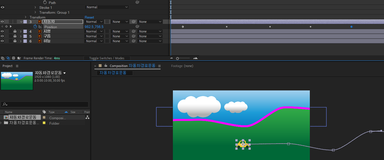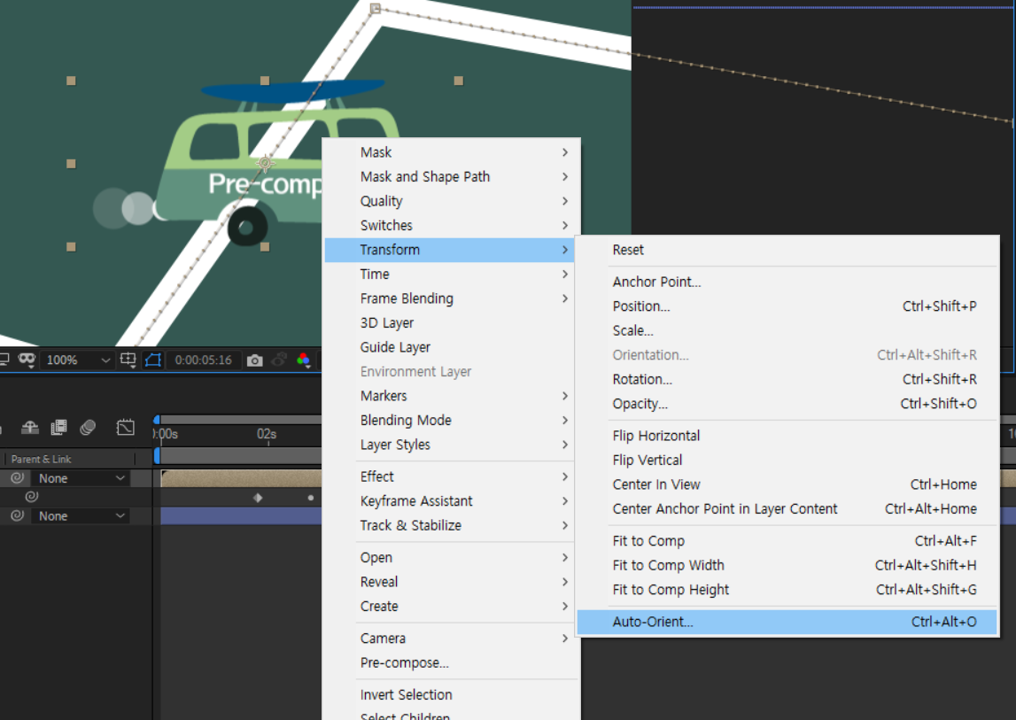 06. 화면중심이 아닌 경로기준으로 애니메이션을 주려면, 자동차를 선택후 Transform - Auto Orient 체크한다.