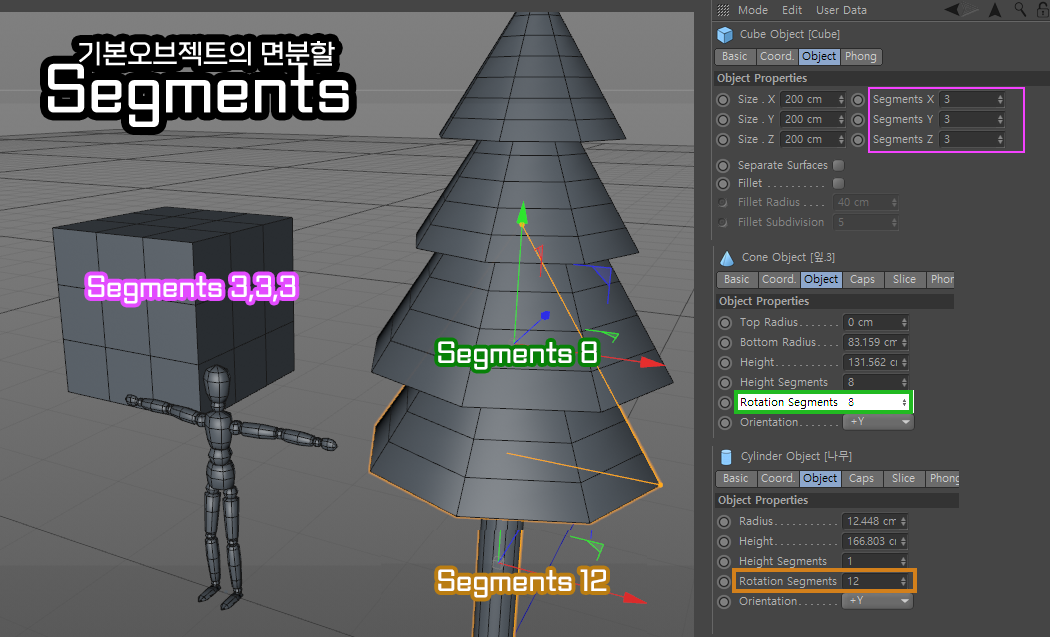 Cube와 같이 추가한 기본 개체는 오른쪽하단의 오브젝트 속성창에서 분햘이란 뜻의 Segments의 X, Y, Z의 원하는 수치만큼 값을 줘 면을 분리합니다.