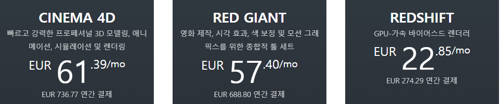 | Cinema 4D €859.77/YEAR 년 1,286,043원 / 월107,170원 라이선스 당 |
