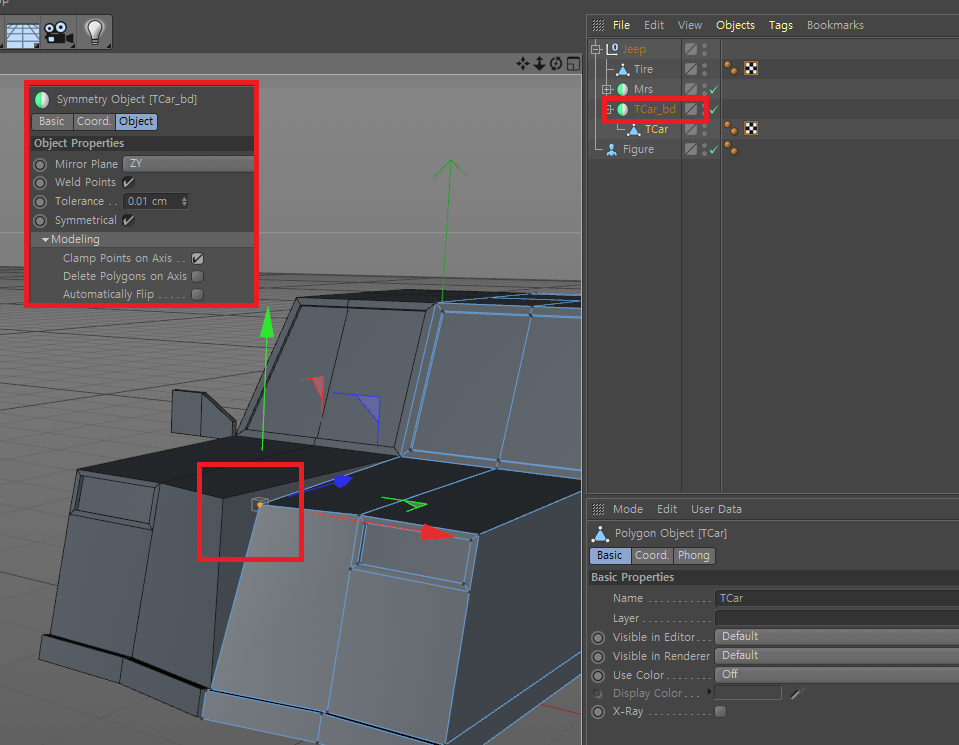 아래는 시멘트리를 적용하기전의 기본 모델링 차체와 별도 타이어2개, 백미러, 손잡이가 별도로 구성되어 필요한 대상들을 그룹(A+G)으로 묶어주고 Null, Symmetry를 추가해서 하부에 넣어서 대칭을 표현해야 합니다.