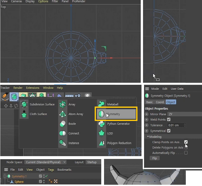 오리진의 위치에서 세로로 오브젝트의 점을 지워 Symmetry를 추가 후 기존 Object의 그룹인 Null을 만든 후에 그림과 같이 Symmetry에 하부에 포함시키면 대칭형 모델링의 시작이 됩니다.