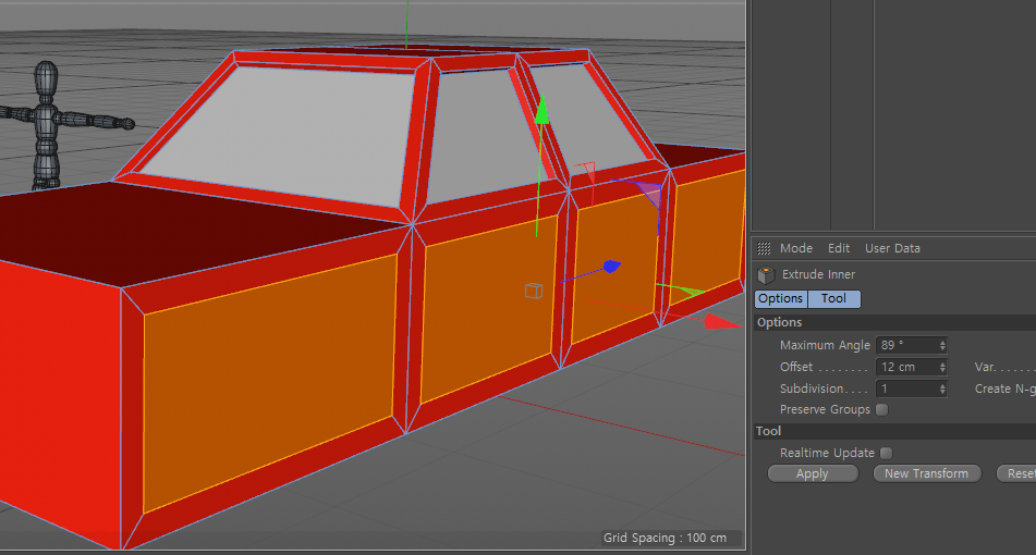 ■ Inset [ i ]: 선택한 면을 안쪽공간(창같이) 생성 우측의 속성창에서 ★Preserve Group 체크여부에 따라서 동시,개별 처리를 해 줄 수 있음. 주택과 자동차의 창과 굴뚝 안쪽의 홈, 타워의 높이를 생성할 때 주로 사용한다. 이전버전은 Extrude Inner로 블렌더의 영향을 받아 인셋으로 툴이름을 변경함.