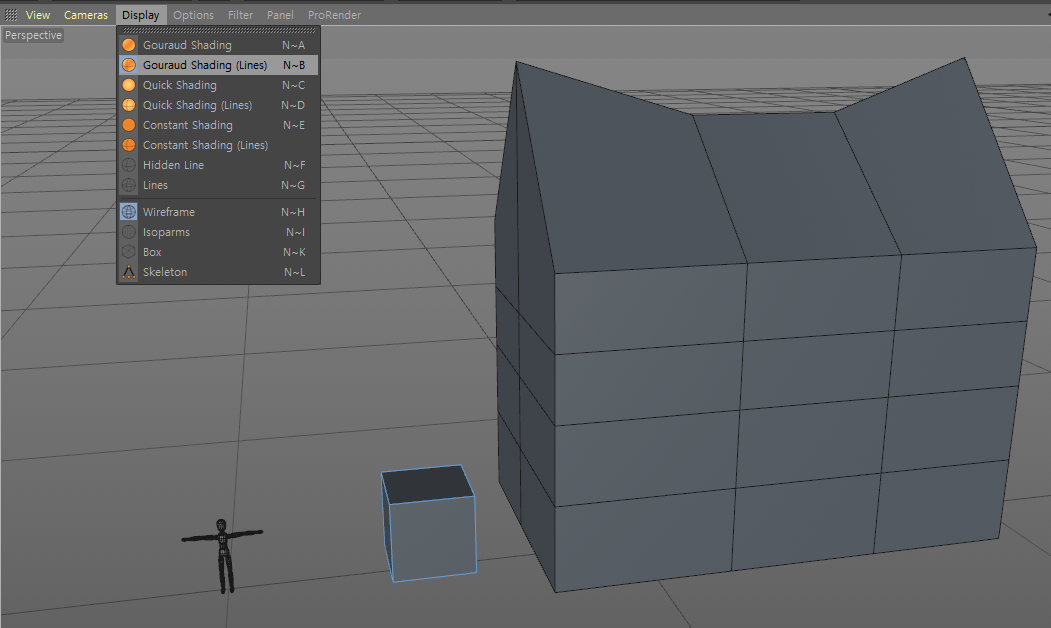 Display메뉴에서 고러드 음영의 라인보기 Gouraud Shading(Line)를 체크해야 Segments로 분리된 점, 선, 면들이 바로 보여서 모델링을 위한 편집에 도움이 됩니다. 변환된 오브젝트는 직접 점, 선, 면을 선택해서 모델링의 기초적인 편집을 할 수 있으며, 편집완료후 나올 때는 위 Model 버튼을 누르면 작업실에서 나와 다른 개체들을 다룰 수 있습니다. 고러드는 3D그래픽의 개념에 ' Computer display of curved surfaces' 개념을 도입한 Gouraud, Henri (1971)의 이름 붙인 것 입니다.