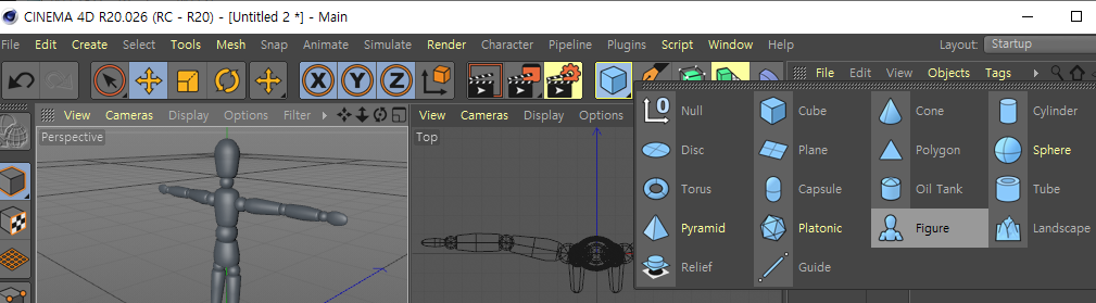 01. 기본 큐브(Cube)를 누르고, 다양한 Object중에서 사람형상의 피겨(Figure)를 추가하면 원점에 보여집니다. R25버전부터는 우측으로 오브젝트 추차 버튼이 이동되었습니다.