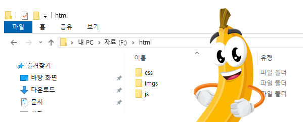 1. 작업하려는 컴퓨터의 디렉토리(폴더)를 아래와 같이 생성한다. 기본 html폴더를 생성하고 / 내부에 필요한 imgs, css, js 등의 폴더를 생성한다. (html폴더가 바로 프로젝트 파일이라 생각하고, 내부의 소스들을 구분한것과 동일하다.)