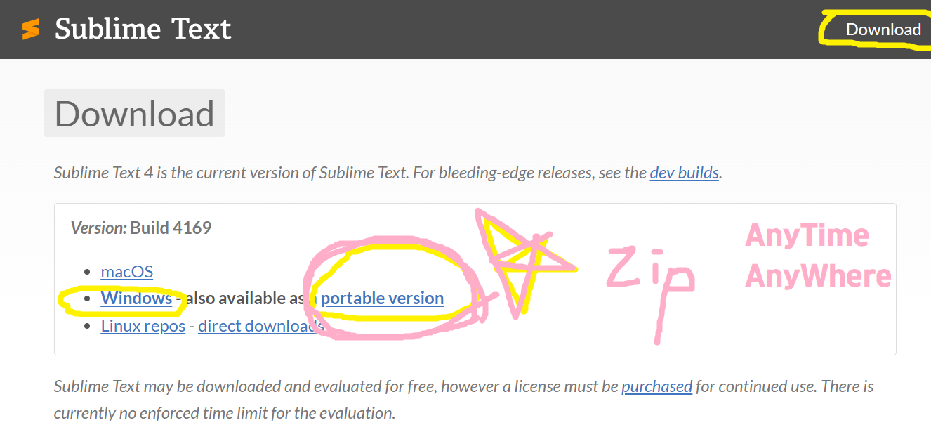 Sublime Text 4 is the current version of Sublime Text. For bleeding-edge releases, see the dev builds. Sublime Text may be downloaded and evaluated for free, however a license must be purchased for continued use. There is currently no enforced time limit f