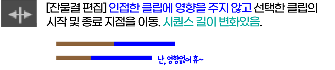 현재 선택된 클립의 앞과 뒤를 임으로 잘라내도 주변 클립 사이의 빈 공백이 없게 편집을 해주는 도구이다. 소스창을 통해 타임라인에 삽입된 클립의 경우는 실제 활용빈도가 거의 없는 도구이다. 잔물결편집도구로 이걸 자를까? 말까?? 고민을 하는 변심편집을 통해 현재 작업하는 시퀀스의 길이, 즉 재생시간 분량이 변화가 생길 수 있다.