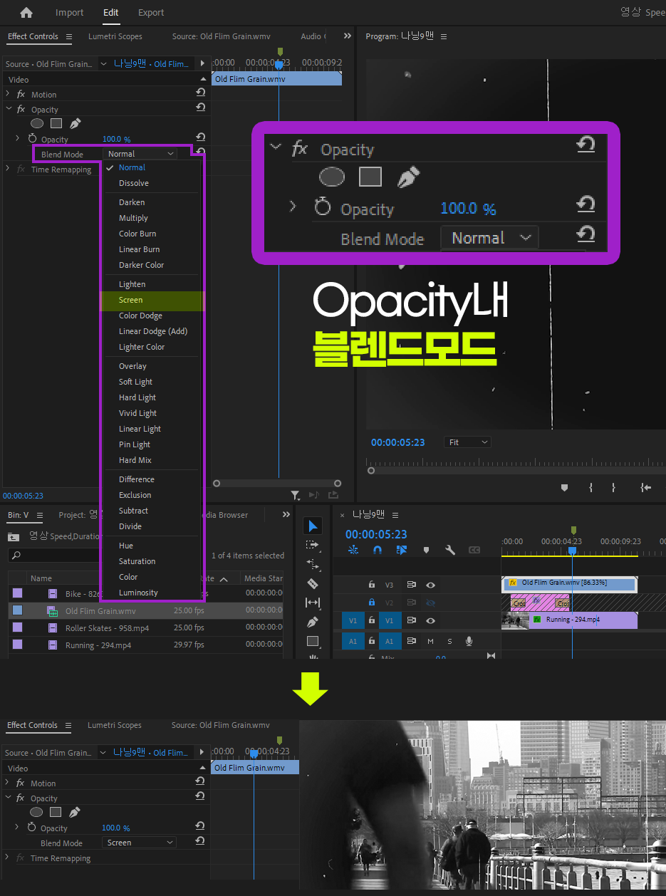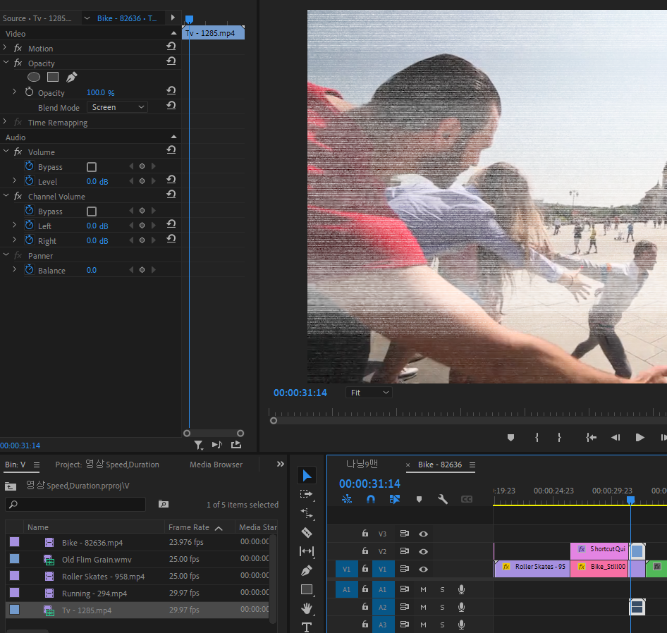 프리미어 프로를 배우기전 포토샵을 배웠다면, 현재 비디오 트랙위에 검은 바탕에 비내리는 오래된 필림의 비내리는 영상을 레이어처럼 위에 올리고, Effect Controls창의 Opacity항목에 있는 Blend Mode의 Screen Mode를 이용해서 표현할 수 있다.