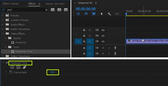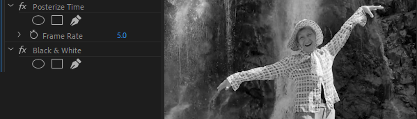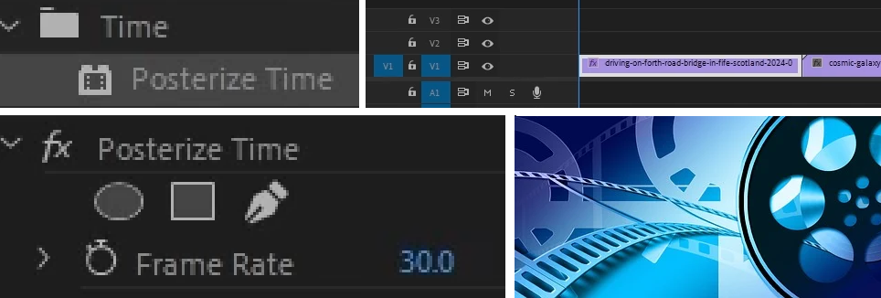 다른 방법으로는 Posterize Time 효과를 추가하고 Frame Rate값을 변경해서 같은 클립이라도 타임라인에서 다른 FPS값을 적용하는 간편한 방법도 있다.