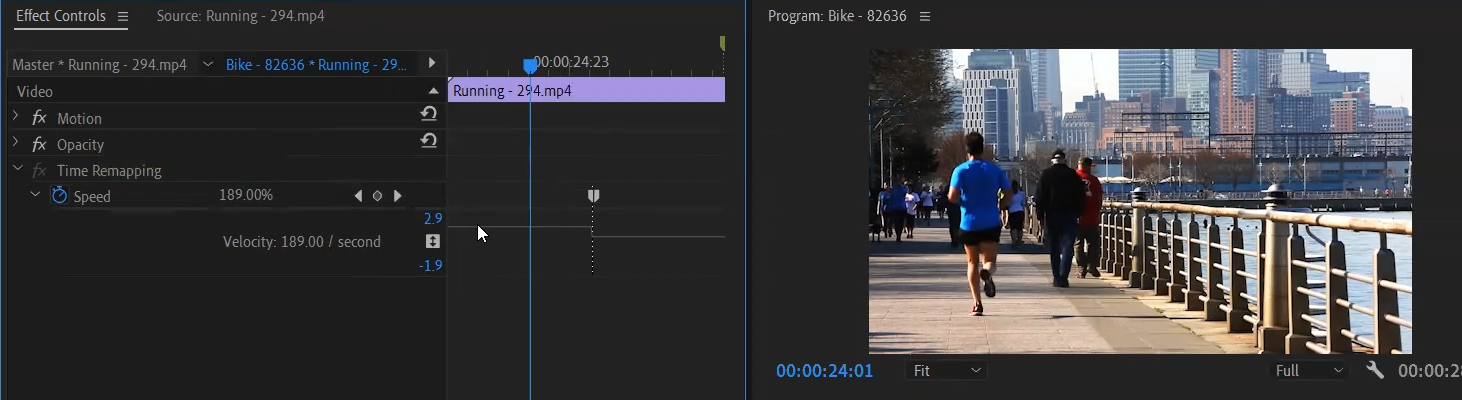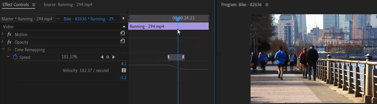 고급스러운 표현이라 많이 사용하지 않지만, Effect Controls패널의 타임리맵핑은 선택한 비디오클립의 원하는 시점에 SPEED에 하나의 키프레임을 삽입하고 / 그 키프레임을 기점으로 왼쪽은 빨래줄을 위로 올려서 속도를 300정도 높이면 L자 형상이 된다. / 위 키프레임을 좌우로 구분되는 분리형인데 좌우중 한쪽을 움직이면 경사가 생겨 자연스러운 속도감을 줄 수 있는 원리이다.