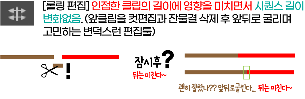 역시 소스창을 통해 타임라인에 삽입된 클립의 경우는 실제 활용빈도가 거의 없는 도구로 컷편집을 했던 클립을 살펴보다가.... 변심편집할 목적으로 이웃한 앞뒤의 클립들의 공간을 굴러다니며 클립 전/후의 공간을 위한 편집에 공을 들이는 편집도구이다. 이 도구로 편집을 하면 이 클립 앞뒤의 클립 2개가 영향을 미칠 수 있는데, 비유하자면 주차된 자동차가 앞과 뒤로 꽝! 꽝! 부딪히면서 차량에 영향을 주고 자기 기준으로 편집하는 형상이 된다.