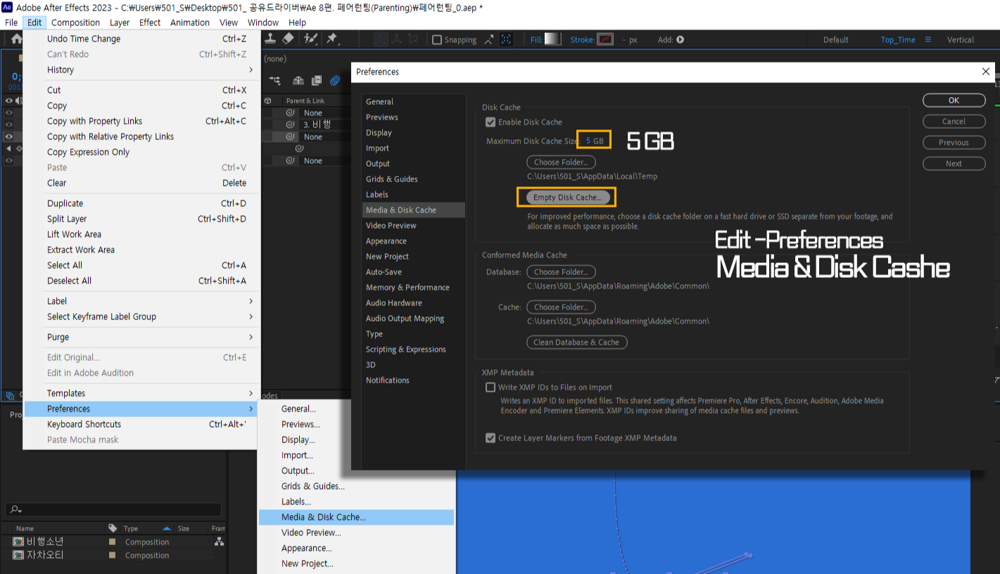 애프터이펙트는 그래픽카드와 램의 사양이 좋아야 원활하고 빠른 작업을 할 수 있습니다. 만약 많은 Video를 추가한 작업을 하거나, 포토샵과 일러스트 파일을 연결한 PSD, Ai 다양한 미디어를 가져다 작업하는 경우에 렉이 걸리는 경우가 많습니다. 콤프창이 검게 보이고 붉은 색 경고로 '새로고침을 하려면 Caps Lock키를 눌러'라는 경고문구가 뜨고, 줄구장창 캡스락키만 누르는 분들이 있는데, 아래 방법처럼 설정을 바꾸거나 캐시를 지우면 조금 개선된 환경에서 작업을 할 수 있습니다.