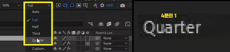 02. 콤프창 하단의 Full로된 해상도/다운샘플링 비율 메뉴 조정