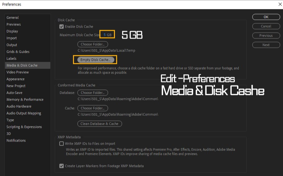 우클릭과 단축키는 없고, 메인 상단메뉴 Edit > Preferences > Media & Disk Cache를 누르고 창을 띄웁니다.