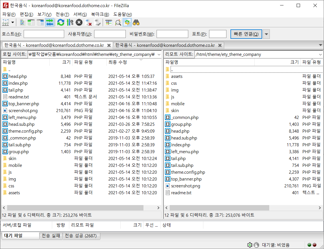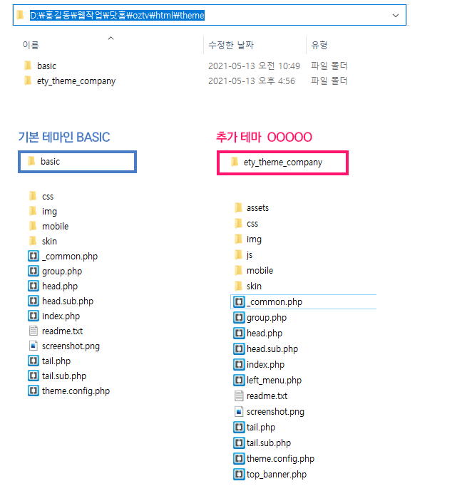 에티 비즈니스 무료테마 v1.5. AAA.zip 압축풀고, 테마가 있어야 하는 Theme/ 내에 삽입한다. 아래 그림과 같이 기본 테마인 basic이 하나 있는데, 여기에 추가한 ety_theme_company가 있고 폴더의 내용을 구분해보니 거의 유사하다는 것을 확인해야 한다.