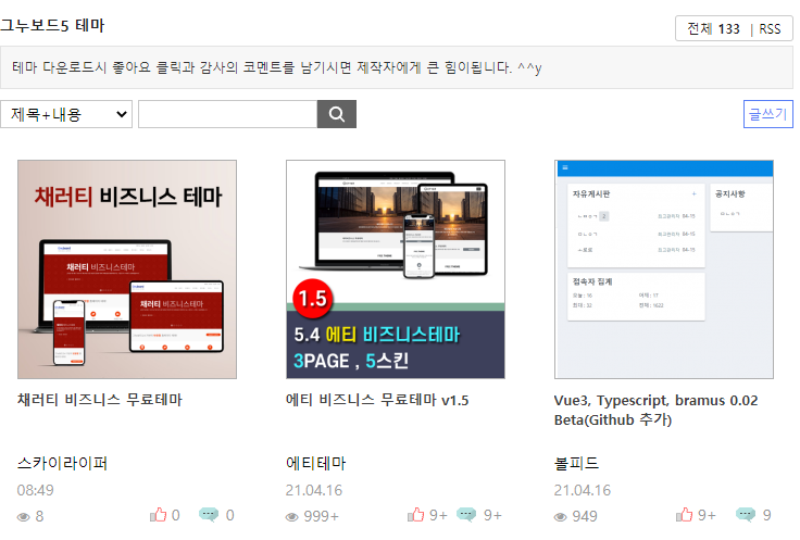 설치된 그누보드5의 테마(Theme)는 웹사이트의 레이아웃과 디자인을 담은 템플릿이다. 그누보드5의 테마 공유 게시판에 가보면 다양한 테마들이 있는데... 설치한 버전에 맞는 반응형웹 테마를 통해서 레이아웃과 디자인이 응축되어 포함된 jQuery, Bootstrap등의 외부 플러그인이 연결된 종합된 팩키지로 외관과 기능을 기본 테마를 새로운 테마로 변경해서 전혀 다른 사이트로 변화를 줘보자.