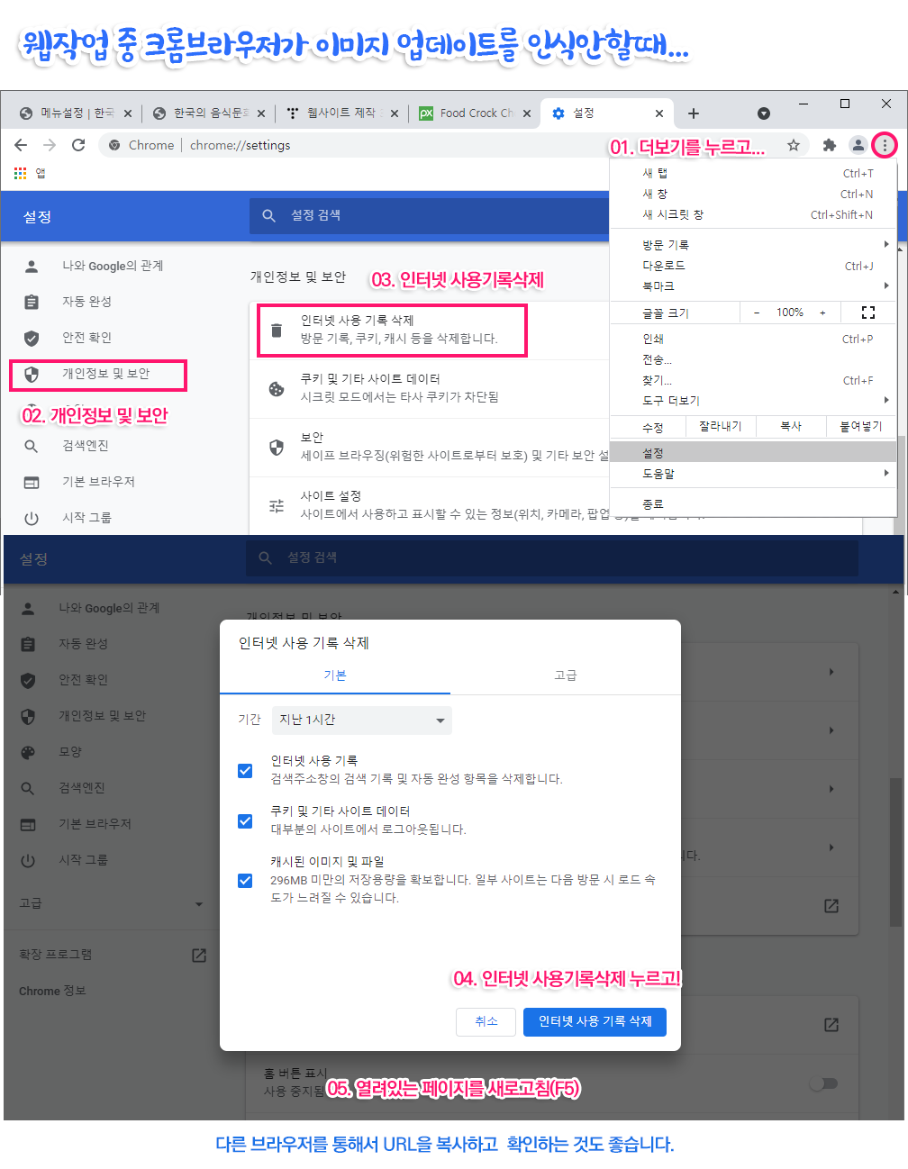 이미지를 교체했는데 브라우저상에서는 그대로 보이는 경우가 있다. 특히 크롬브라우저의 경우 아래 더보기를 통해서 개인정보 및 보안 - 인터넷사용기록 삭제 후 해당페이지를 보면 교체된 이미지를 볼 수 있습니다.