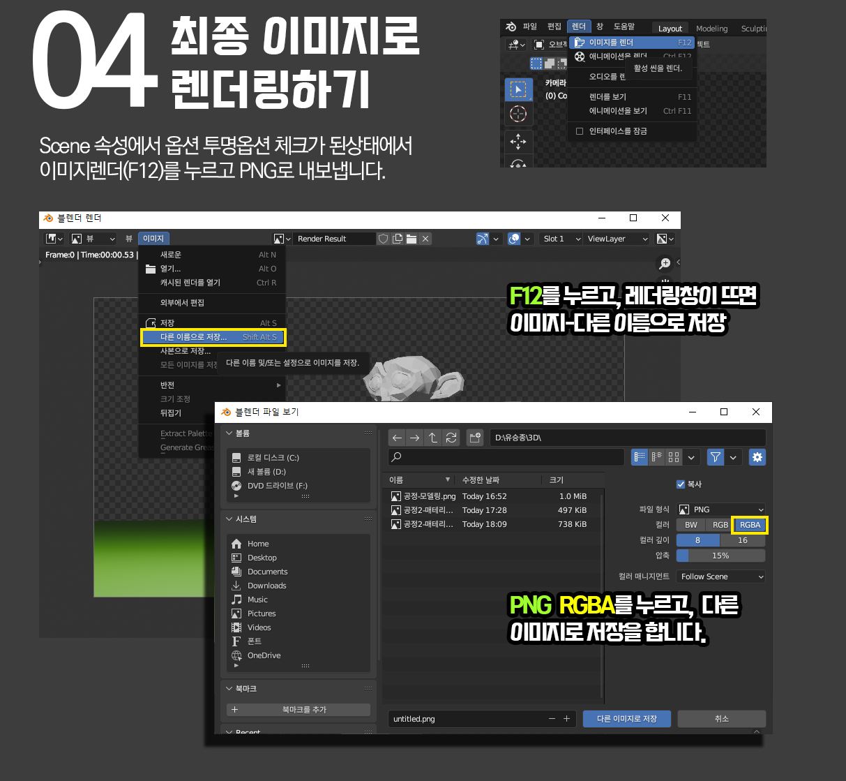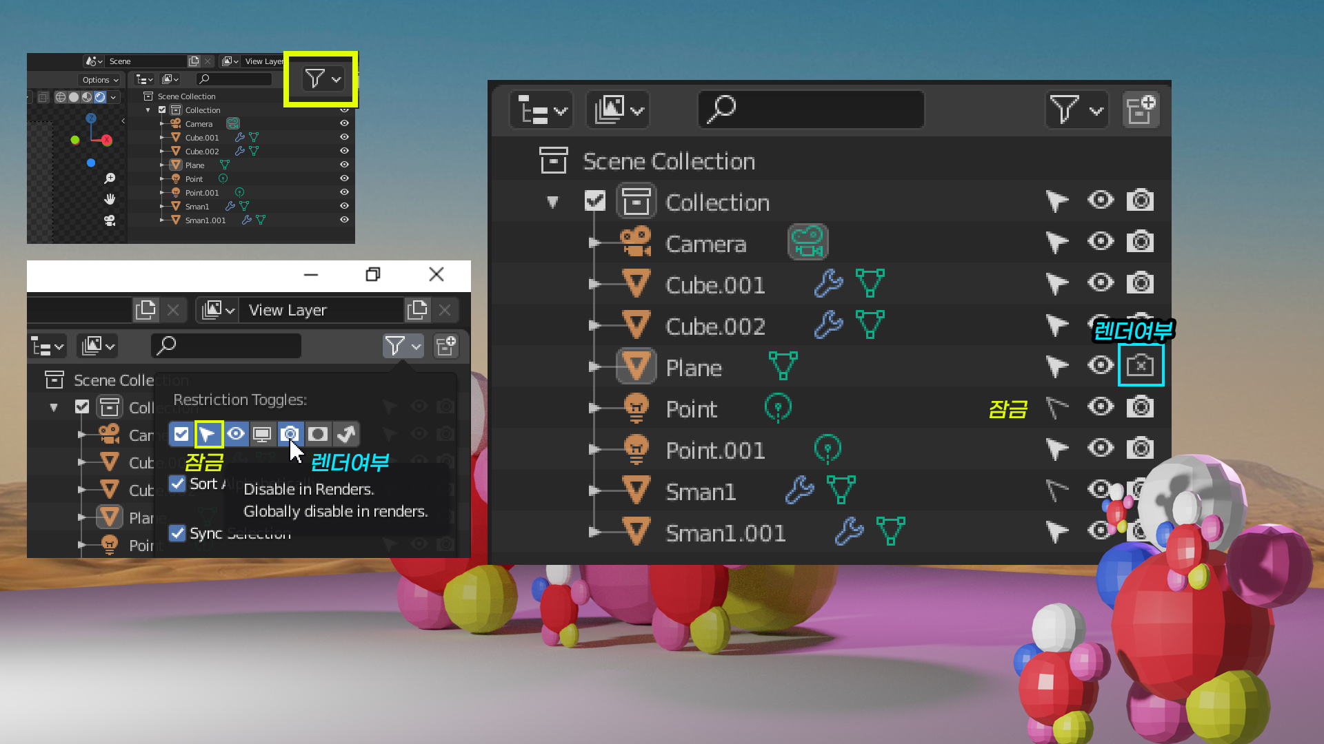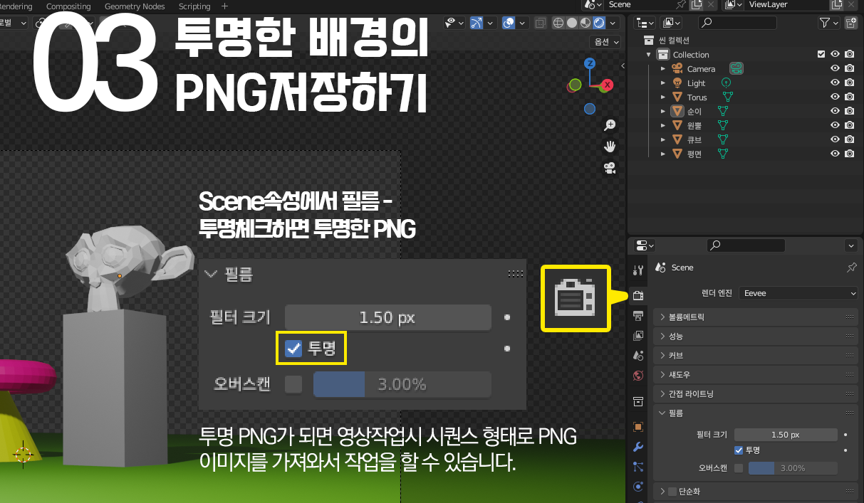 레이어 구조와 유사한 블렌더의 오브젝트 매니저에 기본으로 보이는 항목을 필터링해서 잠그기(Lock)와 렌더여부(Render)를 지정하고 PNG로 내보내보기를 해보세요.