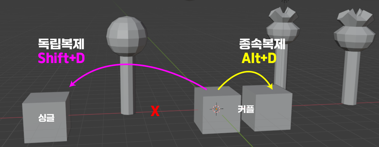 팁텍 블렌더에서도 Object를 복제하는 방법이 있습니다. 단순히 C+C, C+V로 해도됩니다. 독특한 복제방법은 1. 독립복제 : S+D키 / 2. ①종속복제(1개대상수정-다른개체 영향) : A+D키 /// 복제방법 : 위 2중에서 하나의 방법으로 ①키 명령 후, ②방향을 정하여축(X,Y,Z)키 입력 후 ③해당방향으로 가볍게 움직이며 이동복제한다.