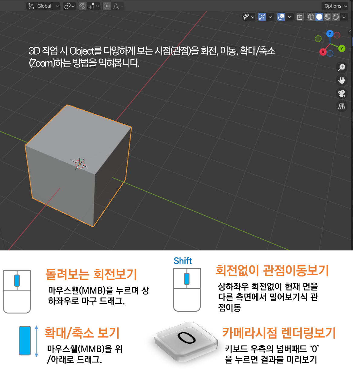 카메라가 보는 관점조작마우스 휠(MMB)/넘버패드 키보드로