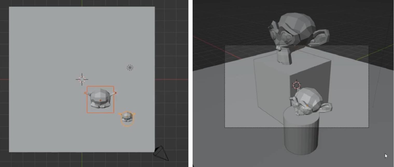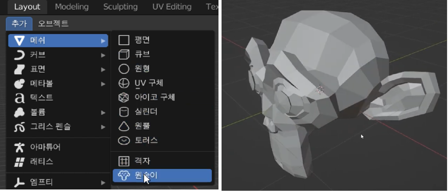 기존의 큐브는 지우고, 공식 모델중 수잔이라 부르는 원숭이를 추가해서 카메라 관점에서 보는 연습을 해보세요.