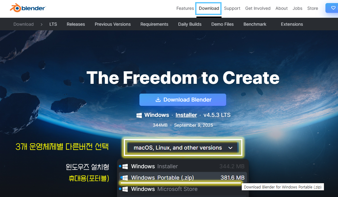 블렌더는 유료 구독이 없는 무료로 사용가능한 오픈소스입니다. 2개의 버전이 있는데 데스크탑, 노트북에 직접 설치하는 인스톨러 설치버전과 USB에 Zip파일을 풀고 실행파일 만 클릭하면 구동되는 이동식 포터블버전을 지원하니 선택해서 다운로드 하세요. [저 사양을 위한 모든버전]