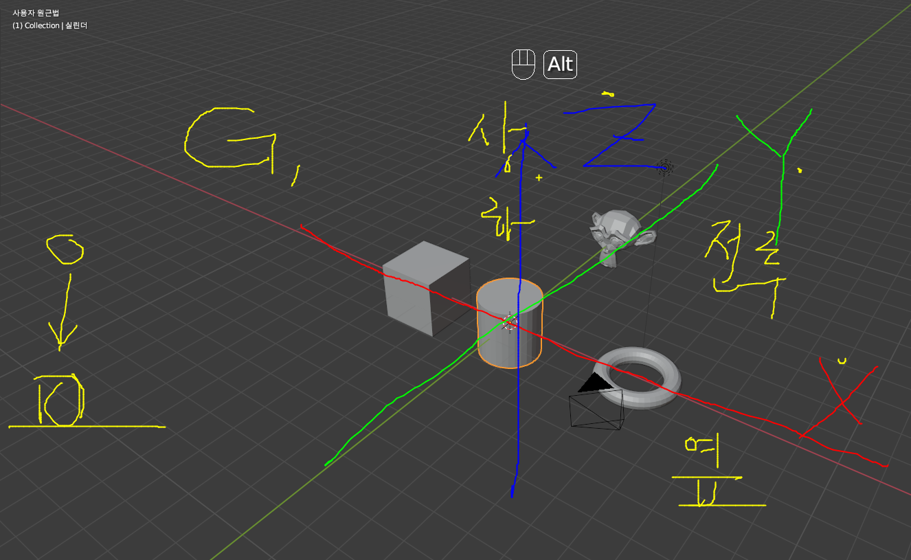 ※ 오브젝트 모드에서 변형을 준 개체는 Alt키로 리셋시켜을 본래 형태로 초기화 시킬 수 있다. 위치초기화 Alt+G, 위치초기화 Alt+R , 크기 초기화 Alt+S 알트는 모조건 초기화 리셋이다~