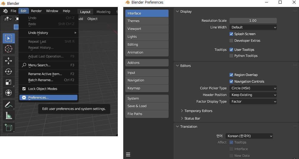 다국어를 지원하는 블렌더는Edit-Preferences메뉴를 통해서 인터페이스의 언어를 한국어로 변경해서 사용할 수 있습니다. 포터블과 물론 설치버전도 편집의 설정에서 인터페이스를 언제든 영어 버전으로 바꿀 수도 있습니다. 영어버전을 통해 배우다가 모르면 한국어 버전으로 바꿔서 사용하세요.