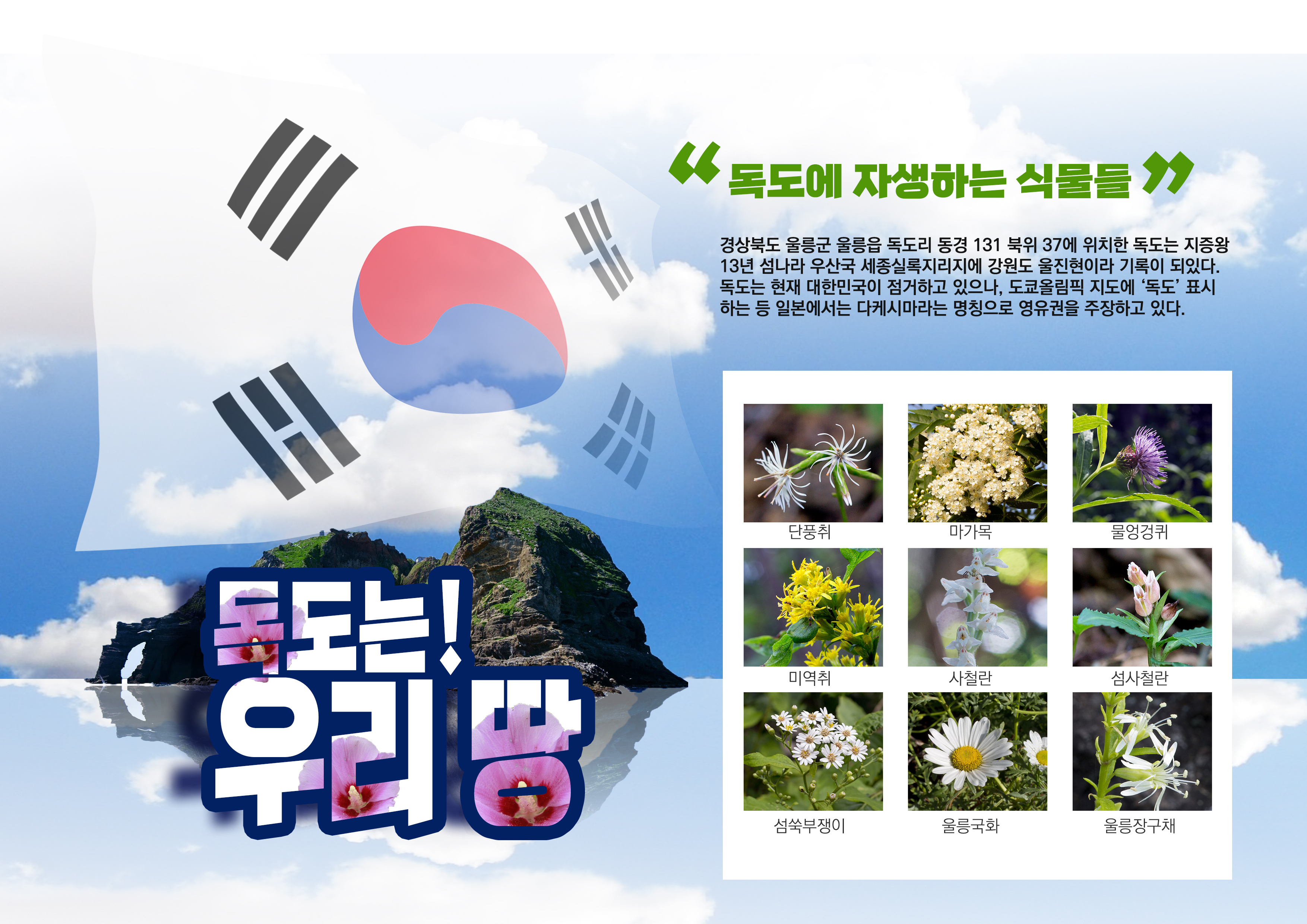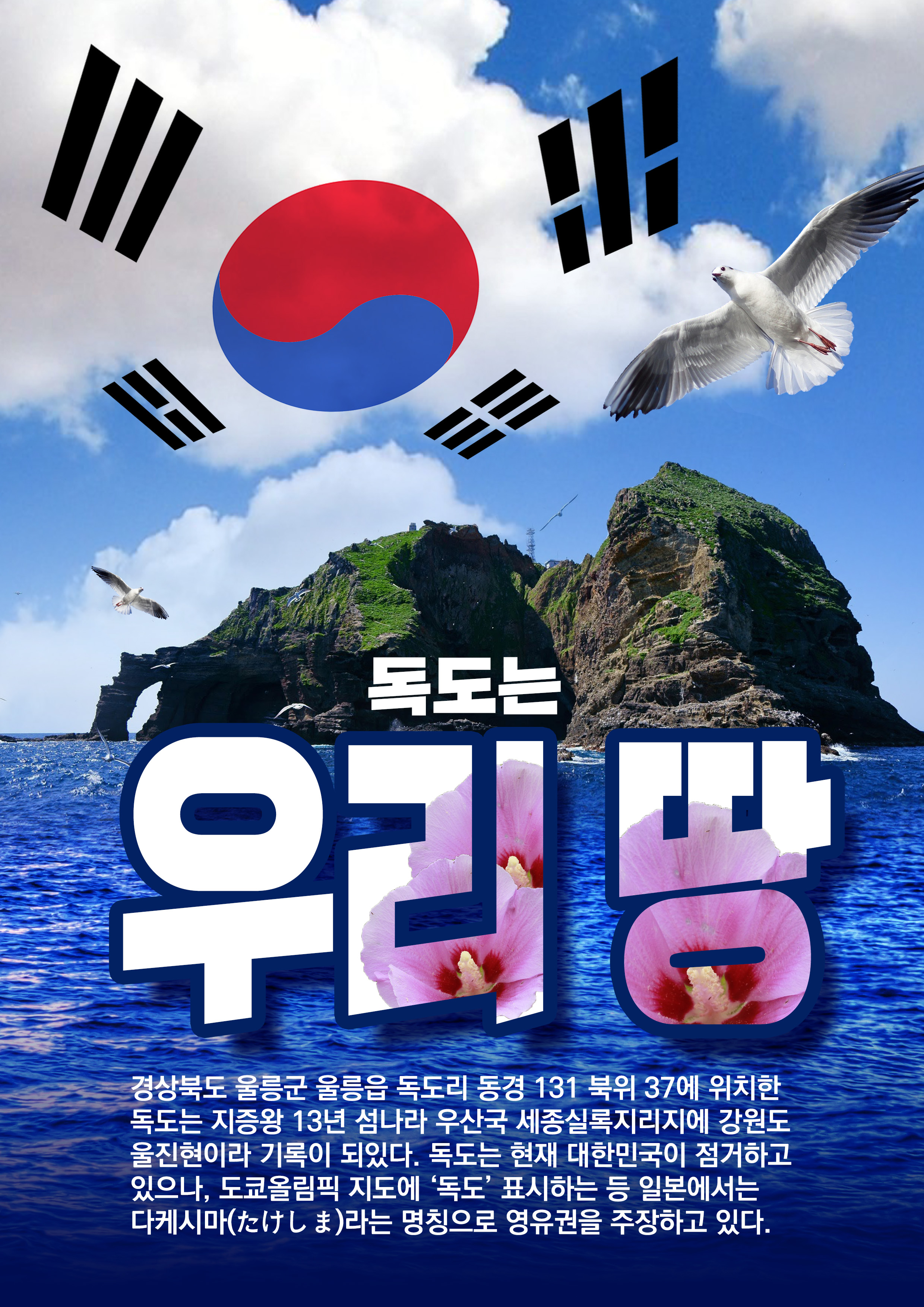경상북도 울릉군 울릉읍 독도리 동경 131 북위 37에 위치한 독도는 지증왕 13년 섬나라 우산국 세종실록지리지에 강원도 울진현이라 기록이 되있다. 독도는 현재 대한민국이 점거하고 있으나, 도쿄올림픽 지도에 ‘독도’ 표시하는 등 일본에서는 다케시마(たけしま)라는 명칭으로 영유권을 주장하고 있다.