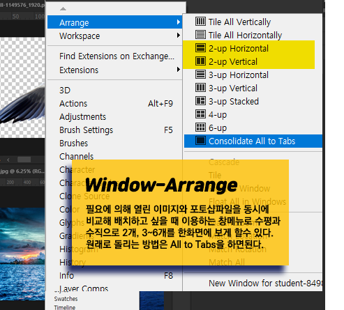 필요에 의해 열린 이미지와 포토샵파일을 동시에 비교해 배치하고 싶을 때 이용하는 창메뉴로 수평과 수직으로 2개, 3~6개를 한화면에 보게 할수 있다. 원래로 돌리는 방법은 All to Tabs을 하면된다.