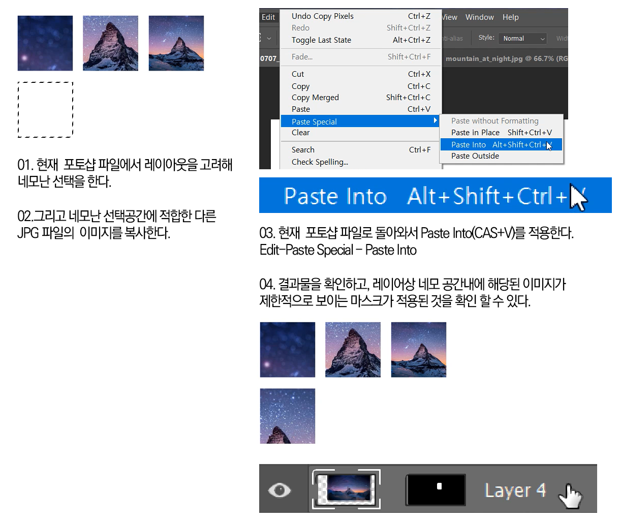 미리 복사 및 잘라낸 이미지를 현재 선택범위내에 붙이는 Paste Into(내부에 붙이기)는 레이어마스크의 다른 표현방법이다. Edit-Paste Special - Paste Into 우리말로 하면 편집-특별히 붙이기-내부에 붙이기이다.