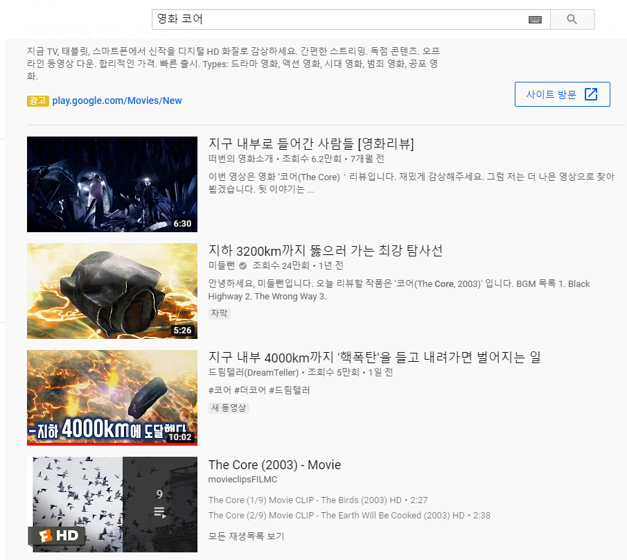 아래는 영화 코어(the Core 2003)의 리뷰를 영상으로 편집한 분들의 검색결과이다. >결과보기