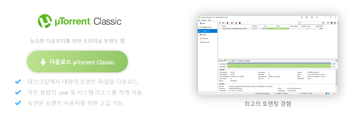 토렌트(Torrent) 무료 멀티플랫폼 비트토렌트 클라이언트로 미디어 및 소프트웨어의 불법 복제물을 유통하는 공간으로 토렌트를 많이 이용되고 있다. '급류'란 뜻의 영어로 배포하려는 파일을 부분적으로 조각내어 공유하여 다운로드되면서 합쳐지는 방식으로 교류하는 것이다 토렌트는 불법형태의 영상물은 물론 컴퓨터용 응용프로그램는 해외에서 유포되어 국내에 퍼트리는 악성적인 불법복제물의 양산의 주범이며, 토렌트의 경로로 방화벽을 무시하고 개방되어 배포/다운로드 자료교류되고 있어 해킹소스가 같이 무방비로 개인컴퓨터에 침투할 수 있는 우려가 있다. [캡쳐] https://www.utorrent.com/intl/ko/