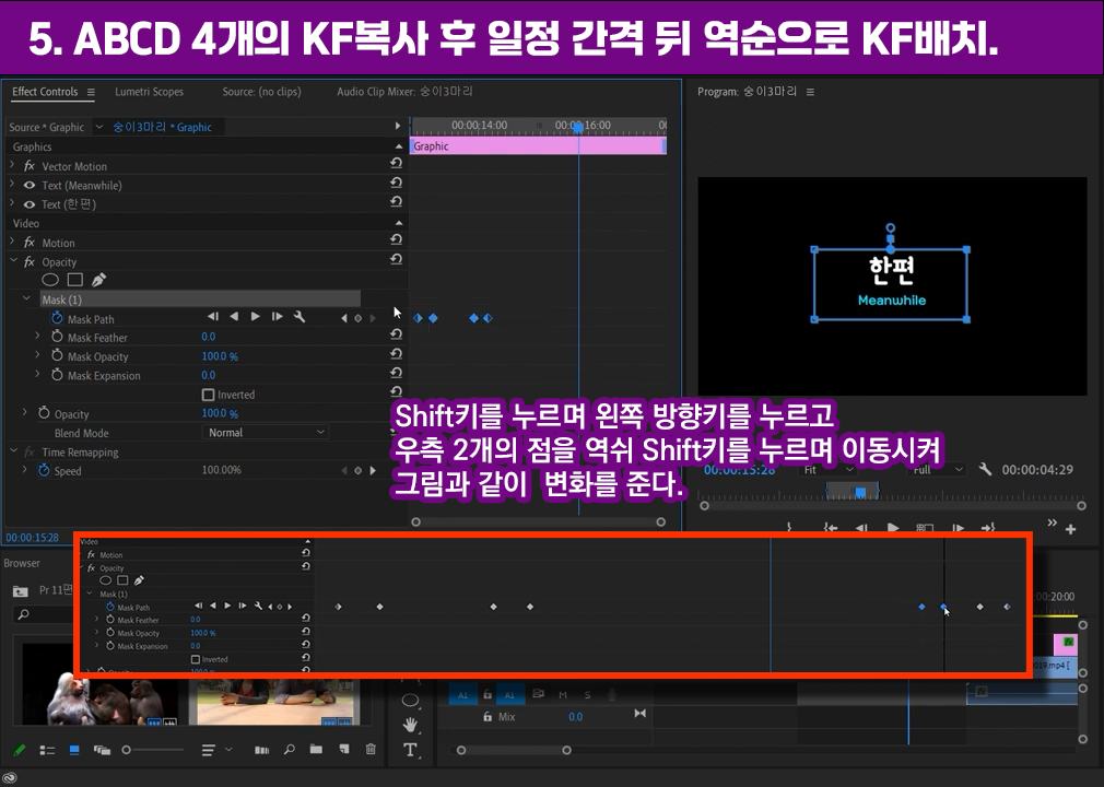 5. 앞에 표현한 키프레임(KF)를 ABCD라 구분해 보고, 뒷부분에 사라지는 표현을 위해 4개의 KF복사 후 뒷부분에 일정 간격 뒤 역순으로 KF배치합니다.