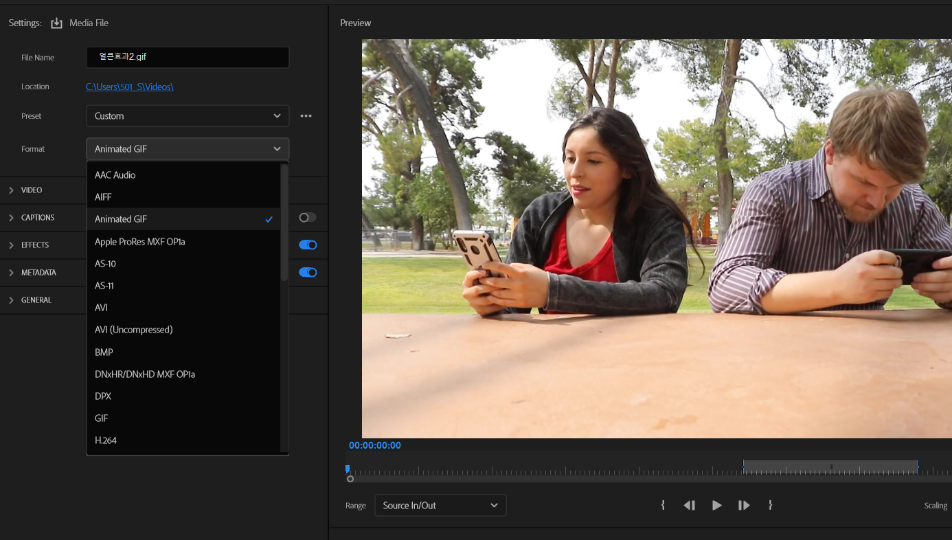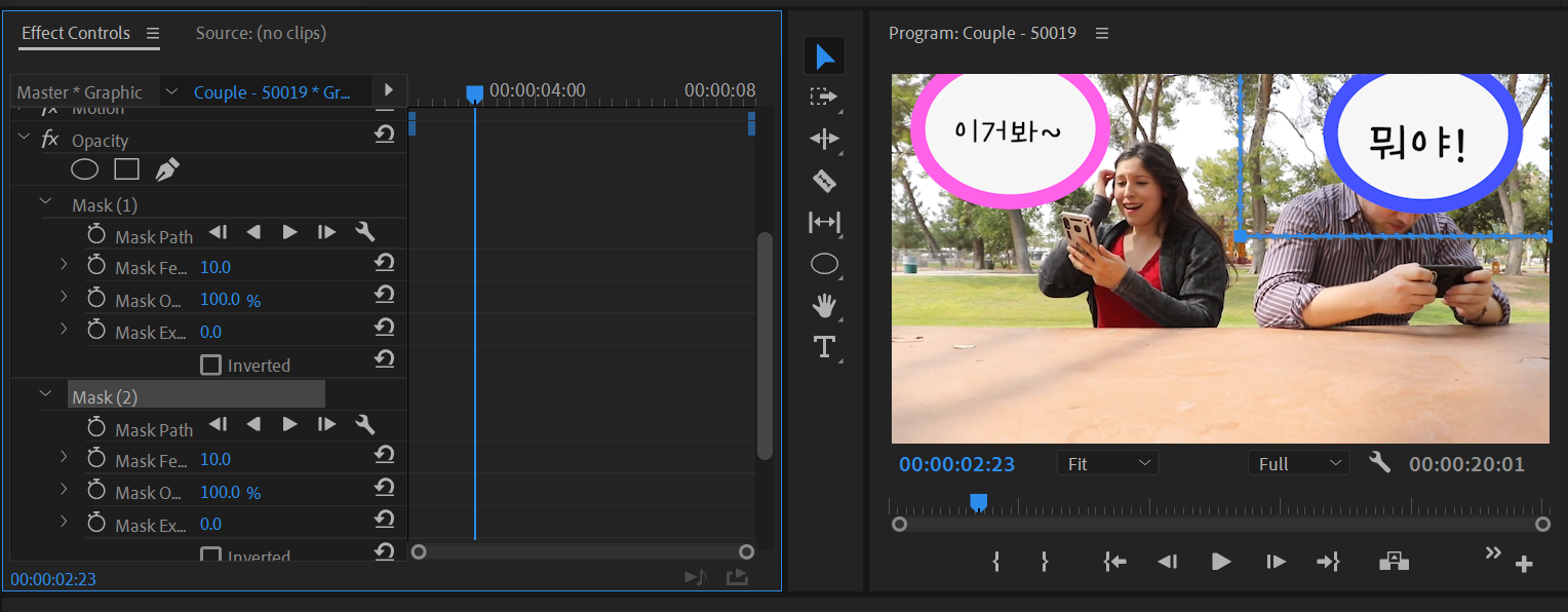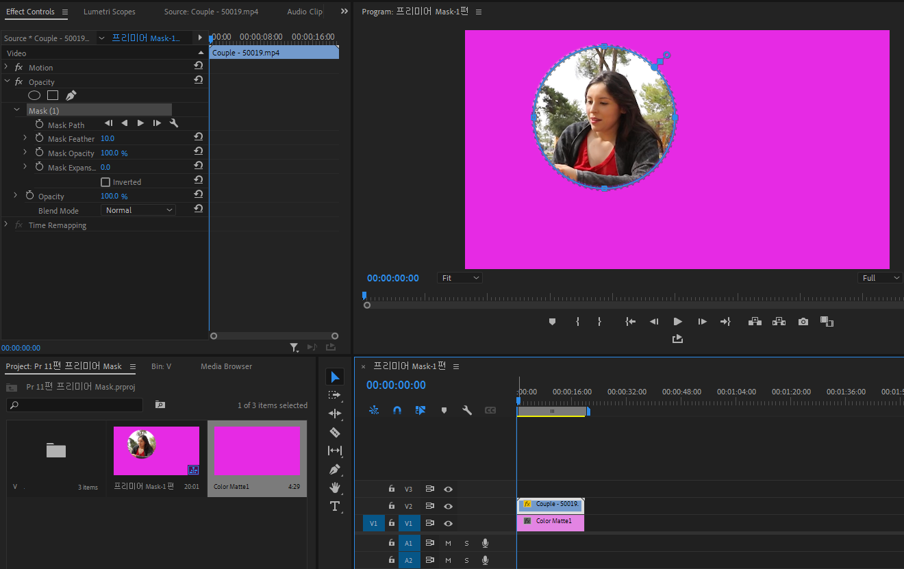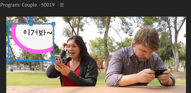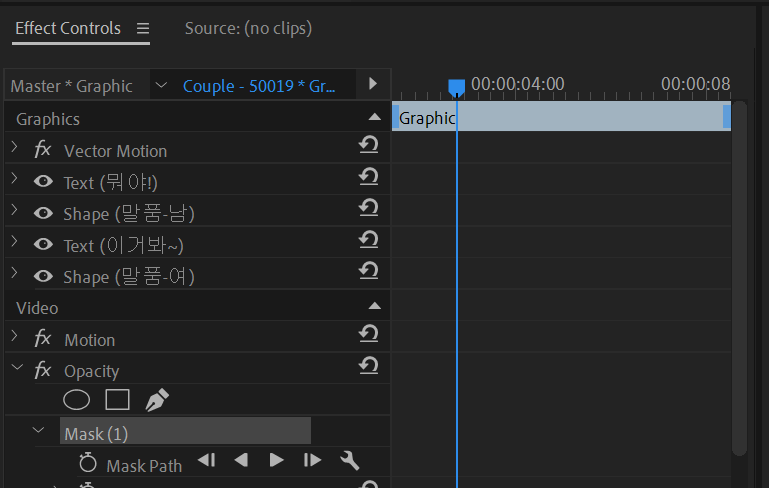 남여 커플영상을 기반으로한 시퀀스에서 해당된 비디오클립을 선택하고, Effect Controls패널(창)을 보세요. Motion아래 Opacity가 있는데 ○ □ pen 모양이 있는데 여기서 ○ 모양의 아이콘을 누르면 Mask1이라는 것이 생기며 타원 형태에만 보이는 영상의 일부를 확인할 수 있습니다. 원의 중심에 마우스를 올리고 움직이면 다른 부분들도 볼 수 있습니다.
