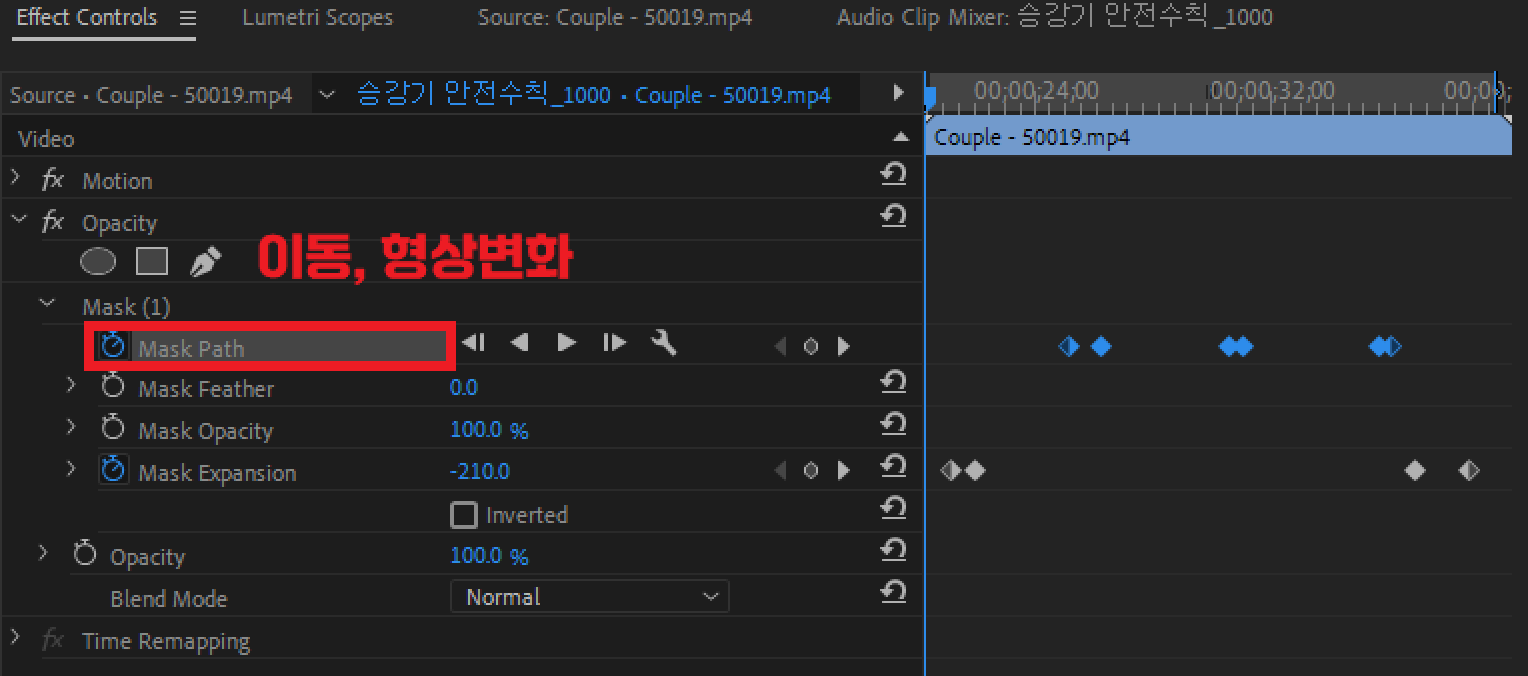 Mask1를 펼쳐 내리면 Mask- 접두어로 경계를 뿌엿게 하는 마스크 페더 Mask Feather : 10 / 마스크 자체의 불투명도 오파서티 Mask Opacity : 100% / 확장과 축소 익스펜션 Mask Expansion : 0.0 의 주요 속성값이 파란색으로 보여지고 수정할 수 있습니다. Mask Path는 모션트래킹을 위해 사용하는 마스크가 움직이거나 변화된 모양이 있을 때 누르는 것으로 인식률이 떨어져서 잘 사용하지 않습니다.