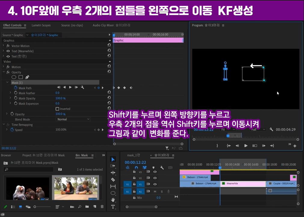 Mask관련된 Image에서 보듯이 Mask는 일부만 보이게하거나, 뒤에는 Video Effect를 일부만 적용하는데 활용됩니다.