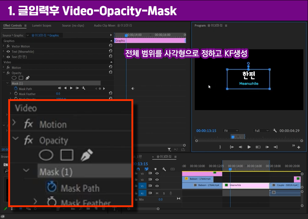 2. V2에 있는 이센셜그래픽 클립을 선택한 상태에서 Opacity에서 마스크를 추가한다.