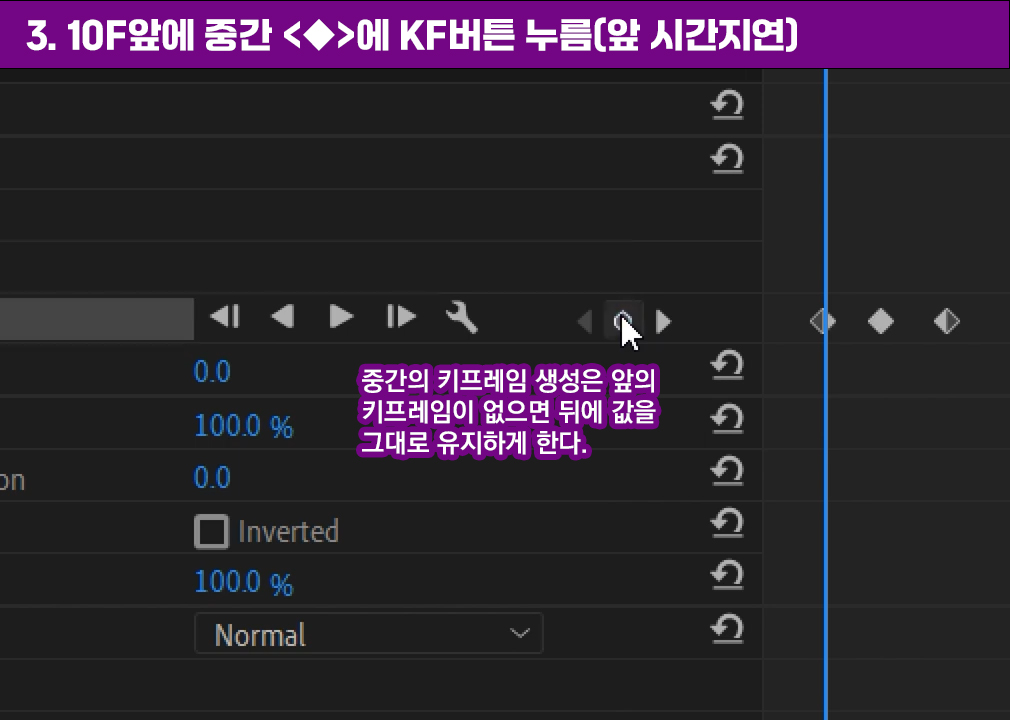 3. 다시 20F 앞에 중간 ◀ ◆ ▶ 버튼을 누르고 잠시 멈춘 시간의 지연을 KF을 추가해서 표현합니다. 이후는 동일한 방법으로 멈추고 변화를 주는 방식으로 표현할 것입니다.