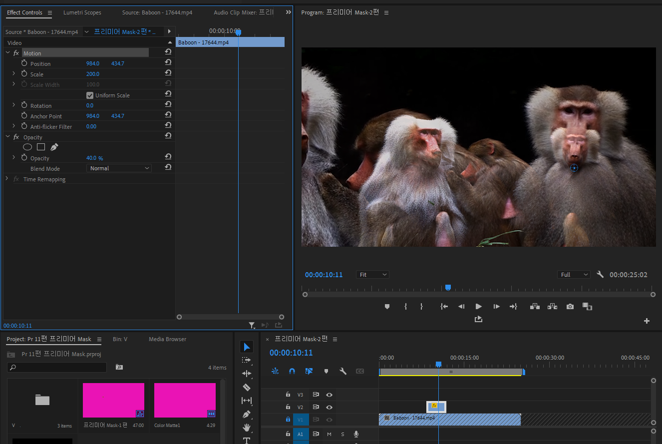 2. V2원숭이 영상클립 선택하고, Effect Control에서 Motion을 클릭한 상태에서 정점(Anchor Point)우측 주인공 원숭이의 목에 맞추어 줍니다. V2트랙에 있는 원숭이 중 1마리의 얼굴을 크게 표현하고 마스크 작업을 하기 위함입니다. V2원숭이 영상클립 선택하고, Effect Control에서 Motion을 클릭한 상태 Scale에서 원하는 비율만큼 크기를 늘여 주세요. 약 190% 정도 원하면 크기를 적절히 조절하세요.