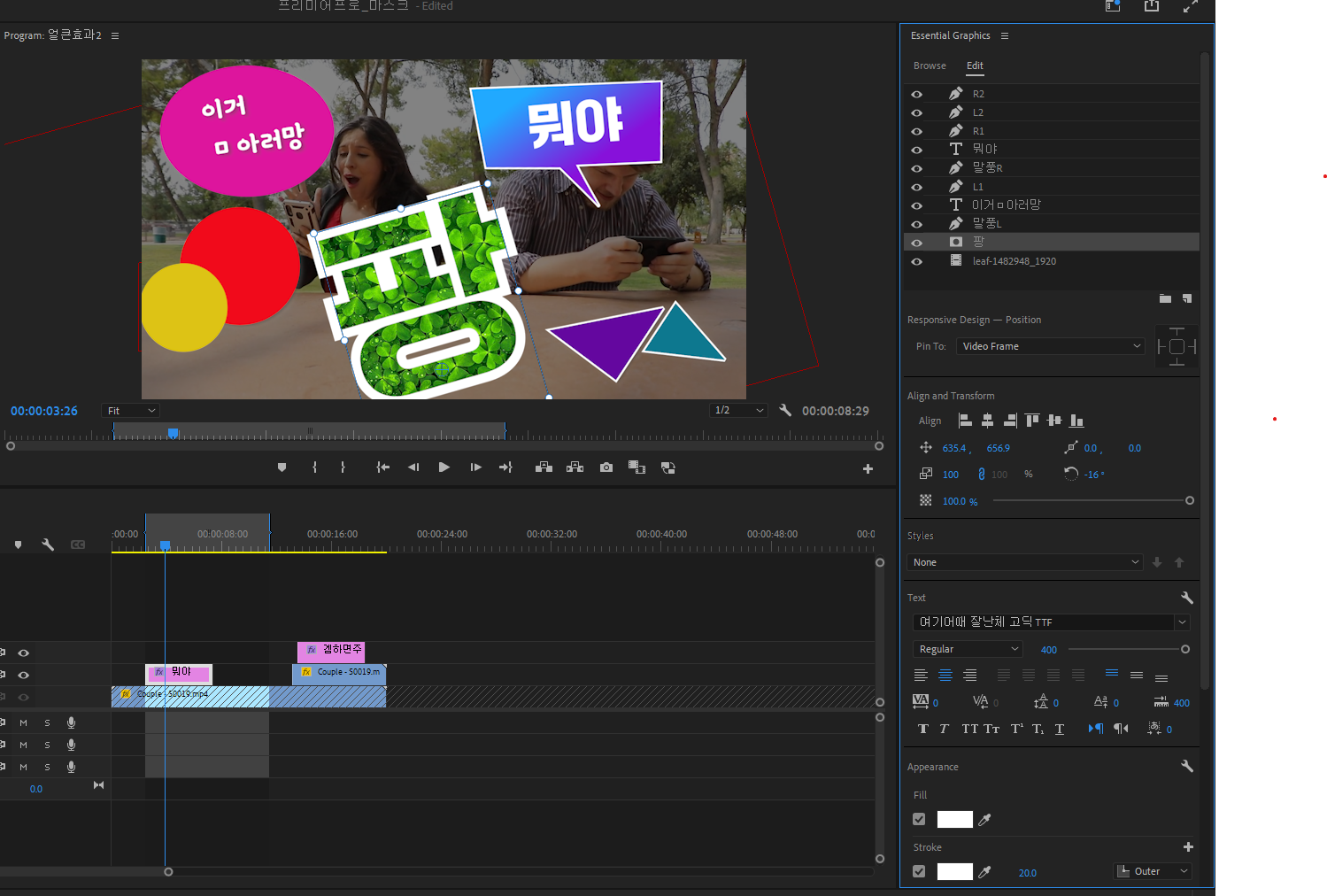 6. Mask Opacity를 값을 0에서 100으로 변화를 주는 키프레임 애니메이션을 10프레임 내에서 표현하면 대화하는 장면을 1개의 이센셜그래픽에서 표현 할 수 있다.