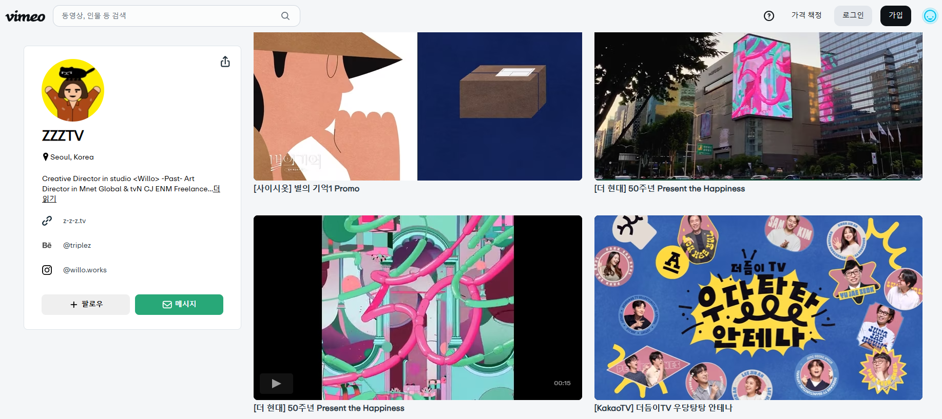 비메오에 공개된 영상들은 익숙한 방송오프닝 영상들로 ZZZ TV채널을 운영하고 있고, 방송 오프닝을 특유의 애니메이션 기법으로 제작하고 있는 인기작가입니다. 이분 제작한 작품들을 보면 After Effects와 Illustrator, Animate 기반으로 작업을 진행하는 것으로 보이며 유명한 방송과 광고의 다양한 작품들 보려면 아래 배너를 클릭하세요.