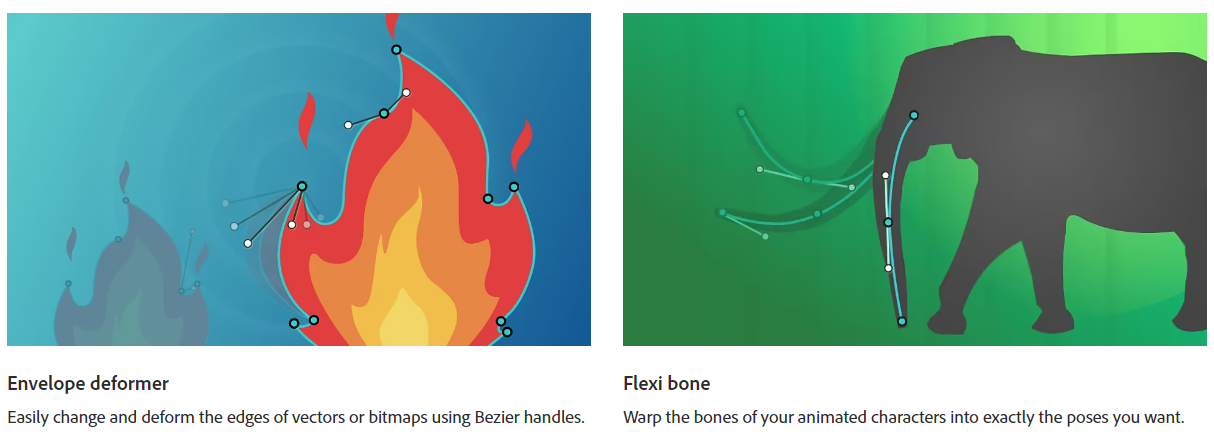 스마트폰의 보급과 Web 2.0시대에서 플래시무비(SWF)의 채택이 안되며 잊혀진 과거의 플래시(Flash)는 애니메이트(Animate)라는 이름으로 게임, TV쇼, 웹용 인터랙티브 애니메이션에 최적화되어 업그레이드 되어 존재한다. 만화와 배너 광고에 활기를 불어넣습니다.애니메이션 낙서와 아바타를 만듭니다.그리고 eLearning 컨텐츠와 인포그래픽에 작업을 추가합니다. Animate를 사용하면 거의 모든 형식으로 여러 플랫폼에 빠르게 게시할 수 있고 모든 화면에서 시청자에게 도달할 수 있습니다. Graphic Symbol을 통해 날개짓하며 움직이는 나비, 코끼리의 움직임을 Flexi bone은 2D 애니메이션에서도 펜툴의 베지어커브와 같은 유연한 관절운동을 구현할 수 있게 해줍니다.