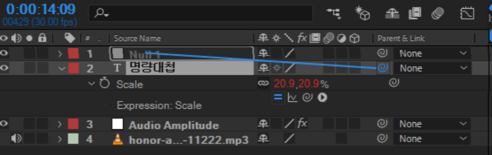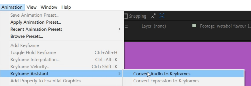 02 오디오 레이어를 선택하고 메뉴 Animation - Keyframe Assistant - Convert Audio to Keyframes을 통해 오디오의 볼륨에 따른 고저파장(Wave)를 인식해서 키프레임으로 생성시켜줍니다.