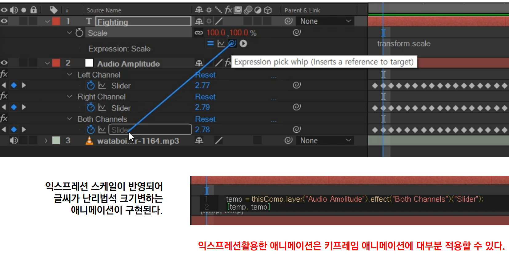 04 익스프레션 Scale(혹은 Rotation)의(Expression Scale) 줄의 모기향(Exp. pick whip)을 누르고 아래 그림처럼 드래그해서 Both Channels의 Slider에 연결한다.