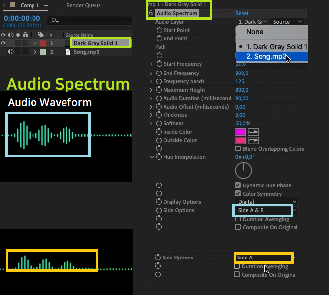 01. mp3 오디오파일을 현재 작업중인 콤프에 추가해줍니다. 이번 효과는 음악파일은 꼭 있어야 합니다. 음악 레이어 위에 짙은 회색의 Solid Layer를 추가한 후에 오디오 볼륨에 반응하는 Audio Spectrum 효과를 추가하고 아래 그림과 같이 Audio Layer를 누르고 레이어중 오디오 레이어를 지정해보세요.